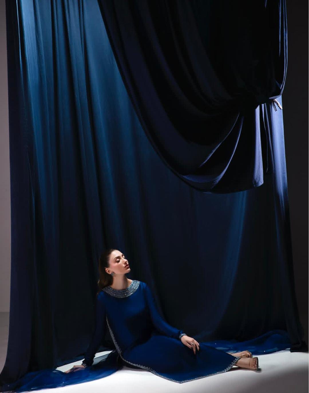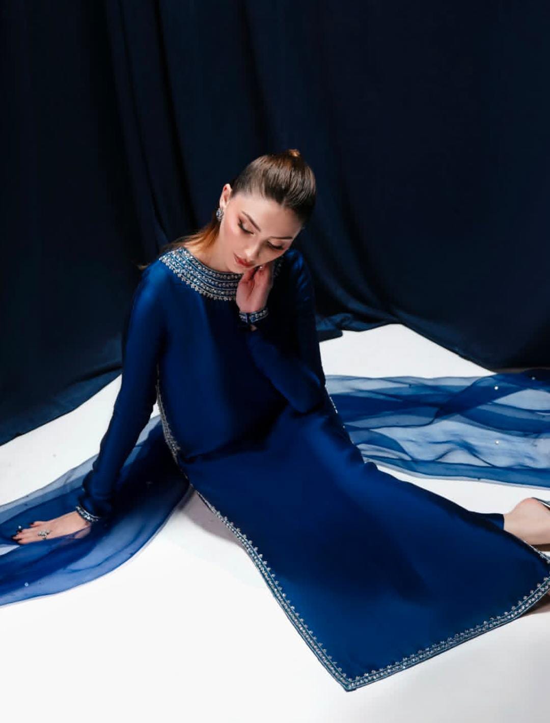 The “Diva” set is a masterpiece that flawlessly combines modern elegance with heritage craftsmanship. This panelled A-line shirt, crafted from premium pure silk, offers a majestic flare and a royal midnight blue hue. Adorned with shimmering silver hand-work, it is the ultimate choice for those who want to embody grace and tradition.