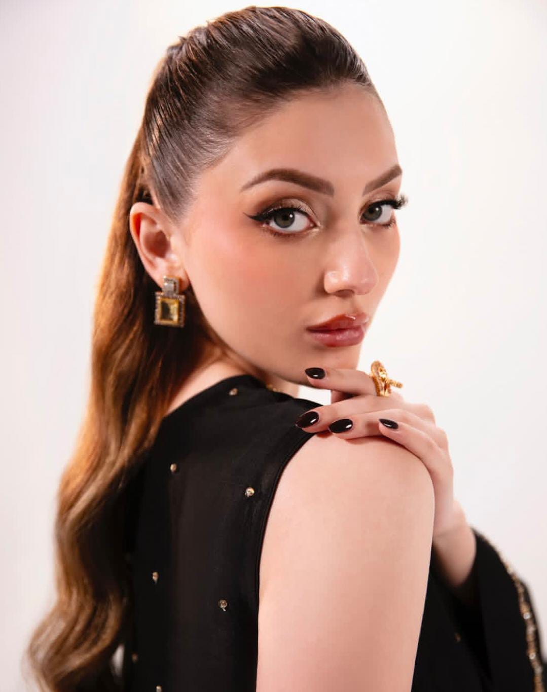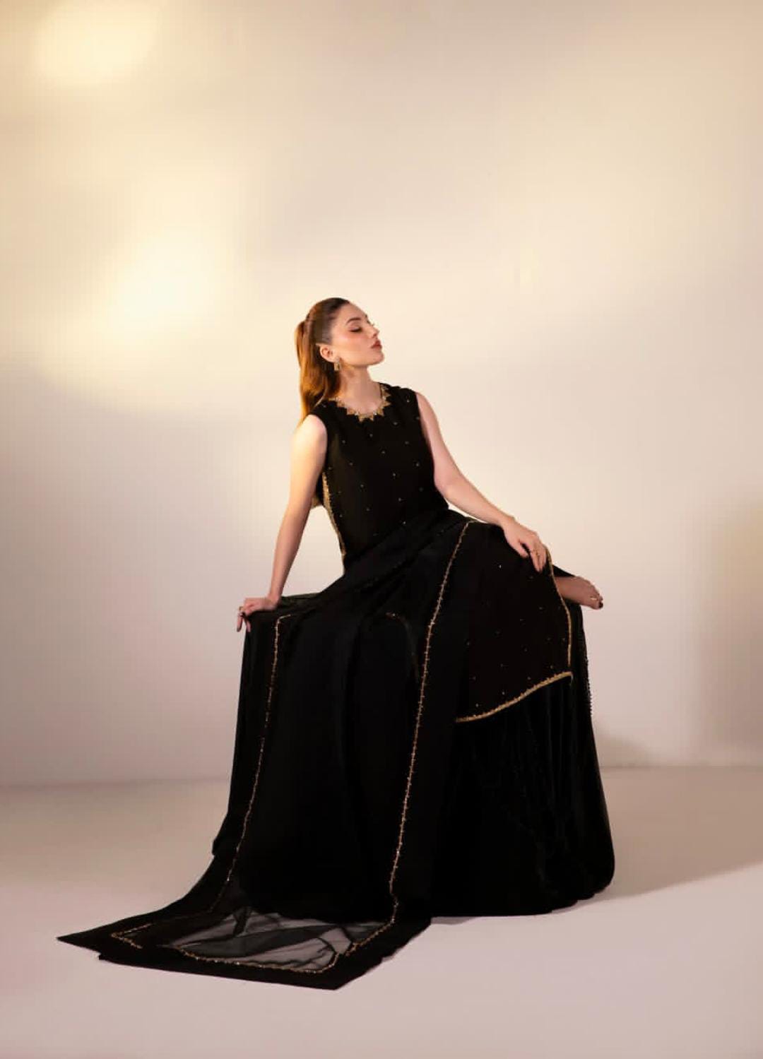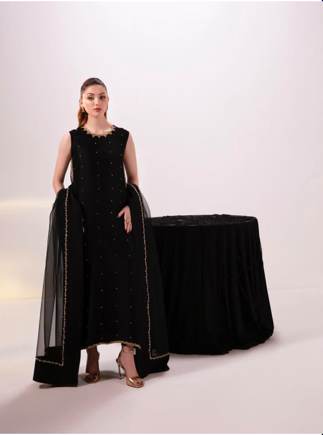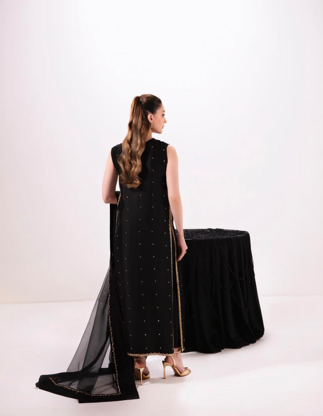 The “Melody” set is a timeless tribute to winter luxury. Crafted from the finest Micro 9K velvet, this deep black ensemble is designed to make a statement at any formal evening. The long, straight silhouette is meticulously adorned with delicate champagne and silver stonework, reflecting a quiet yet powerful elegance that is synonymous with the Dilkash woman.