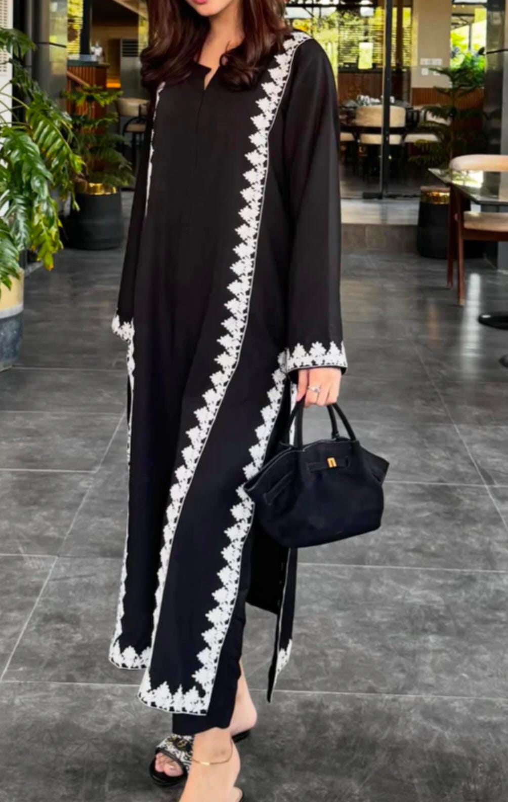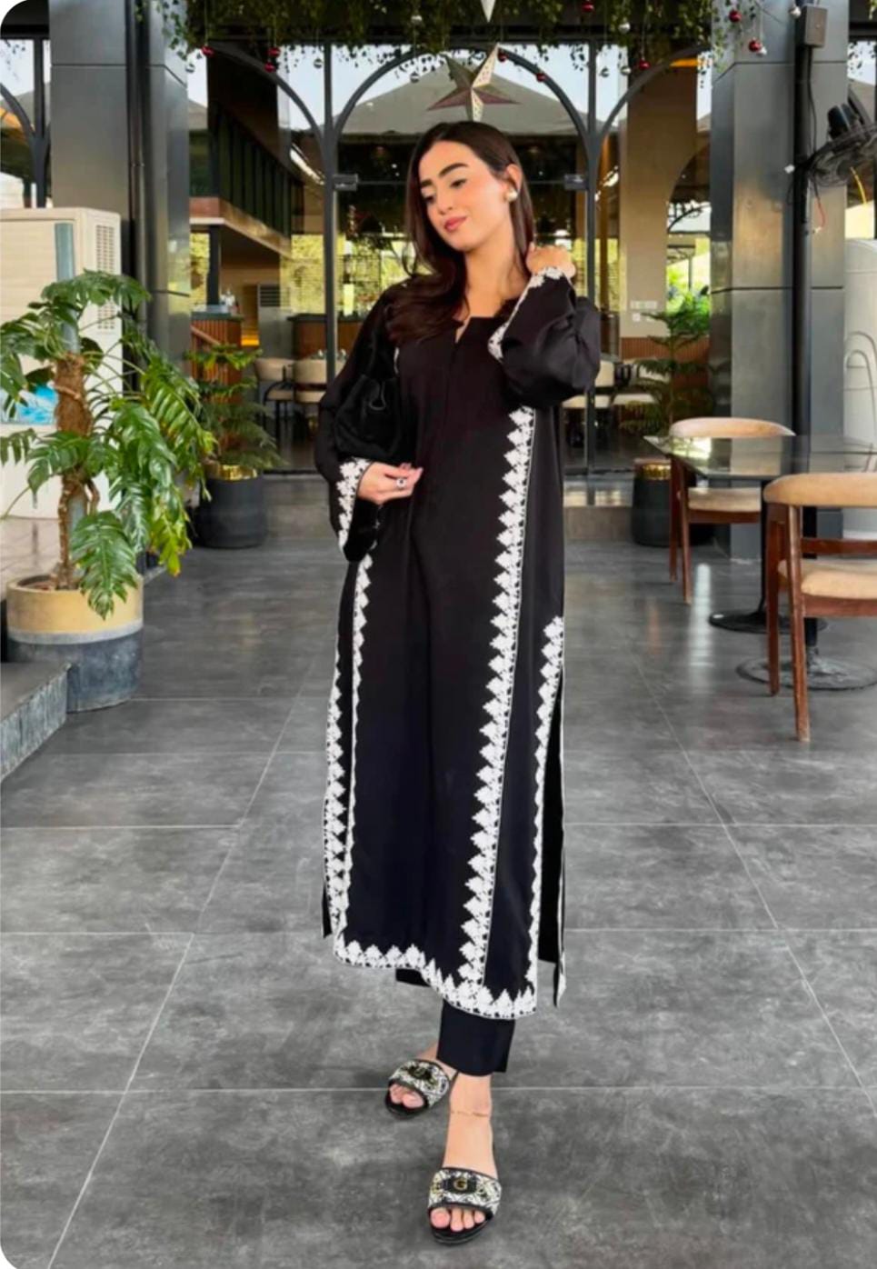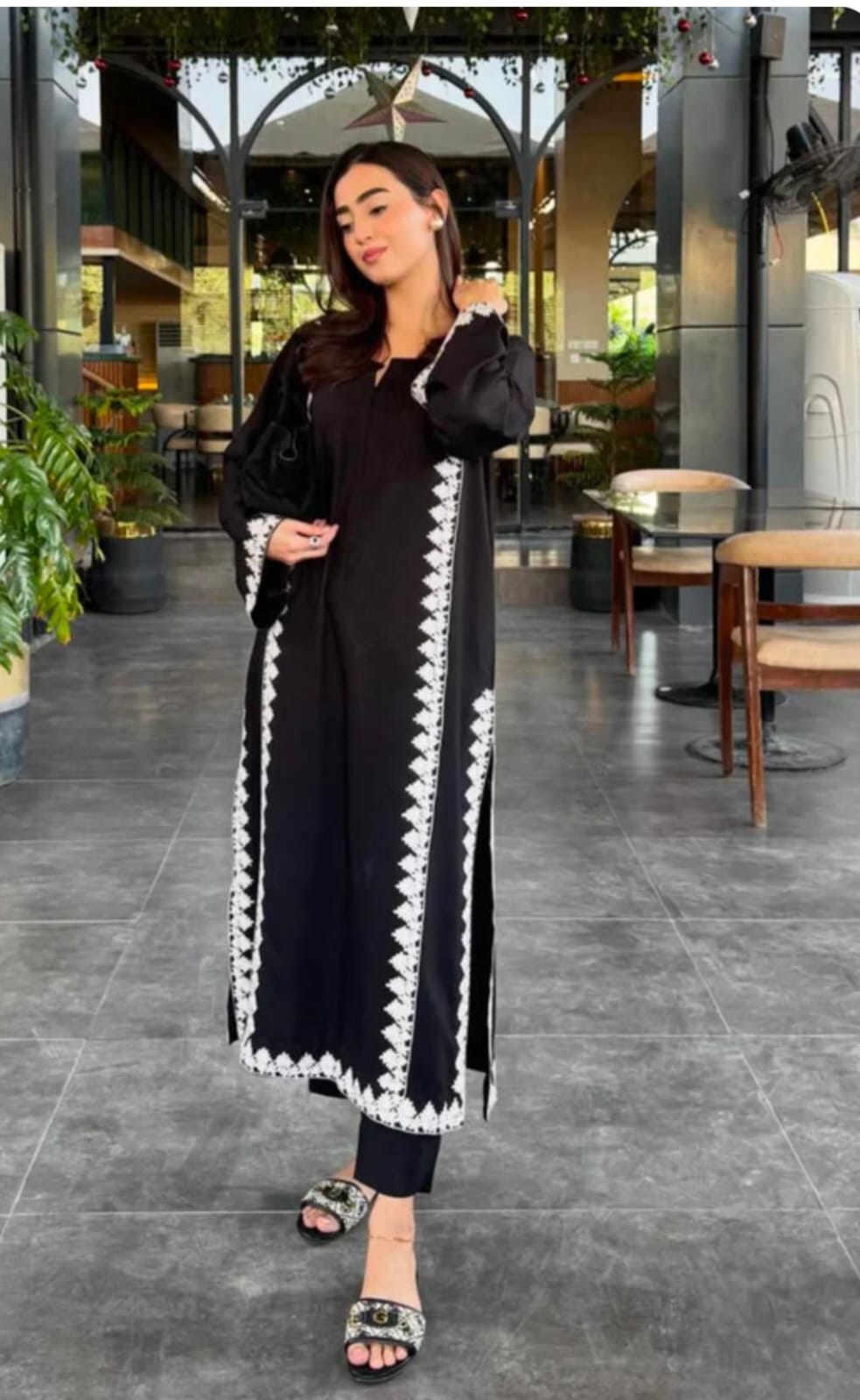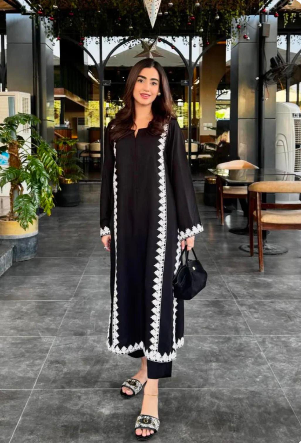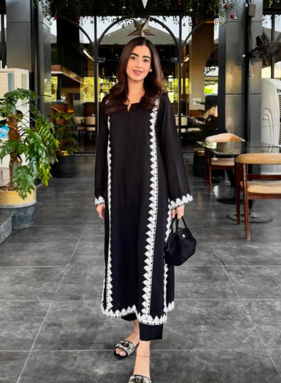 A classic black ensemble never goes out of style. This 2-piece set from “Dilkash by Iqra Tasadaq” is crafted from high-quality summer krandi, making it the perfect choice for the transitional weather. The deep black base is enhanced with intricate embroidery on the shirt, offering a sophisticated look that works for both casual outings and evening gatherings.