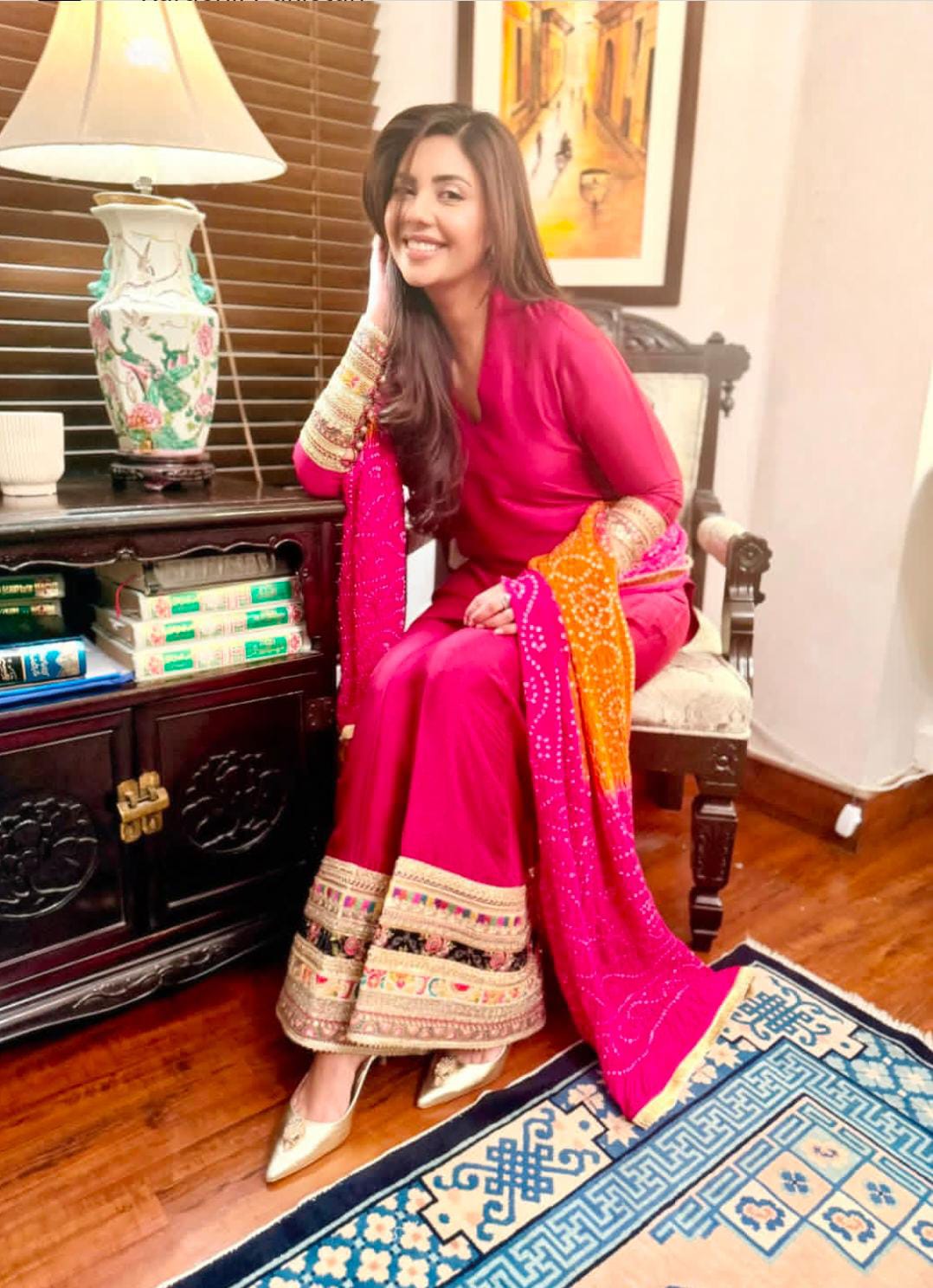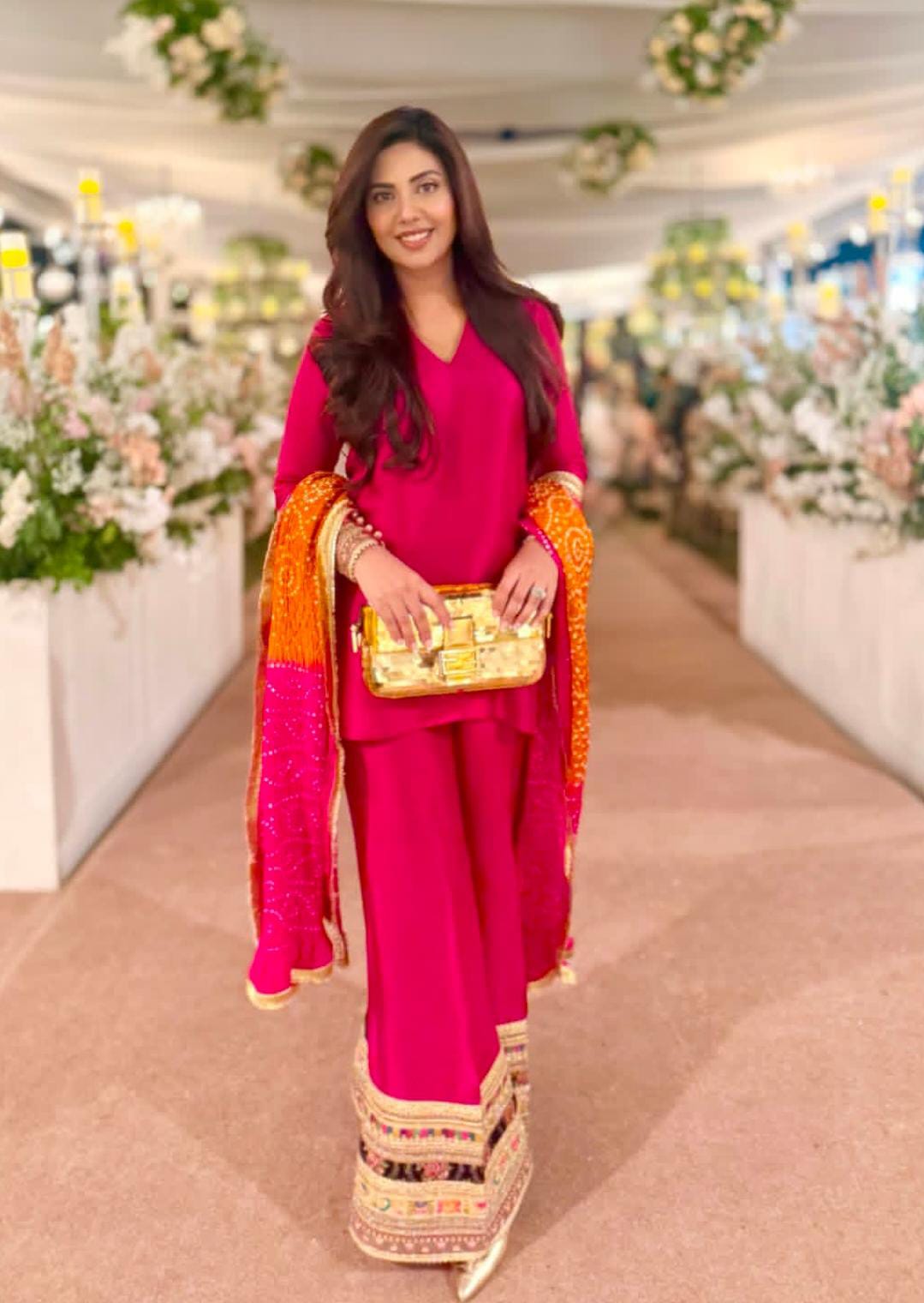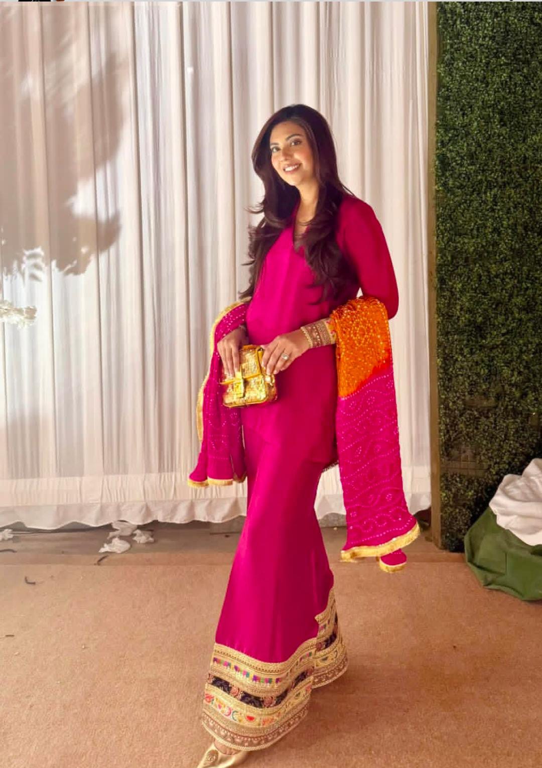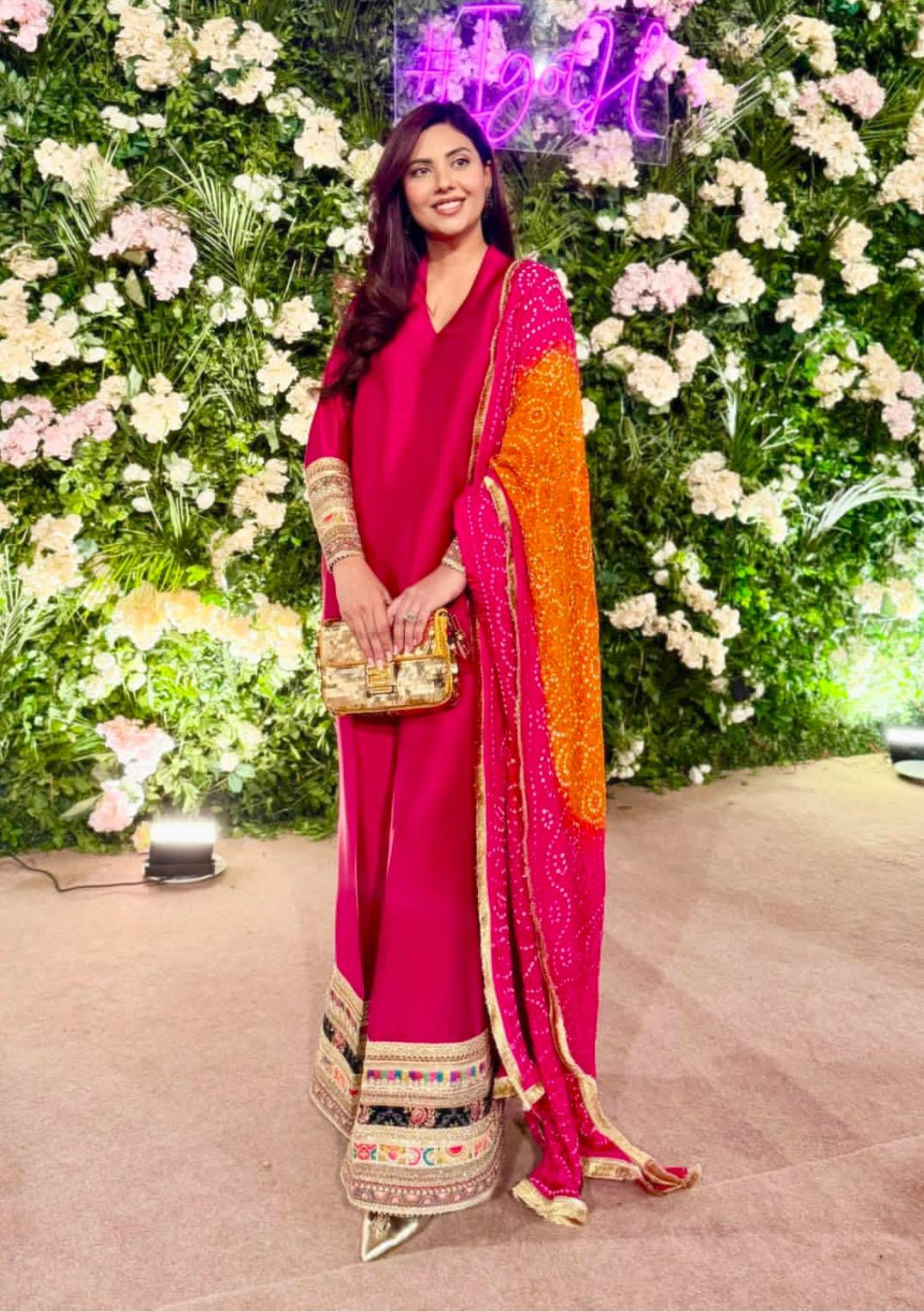 Shirt: Premium pure silk shirt featuring a long, flowing silhouette (50-52 inches). The front is adorned with exquisite thread work and hand-placed sequins that catch the light with every movement.