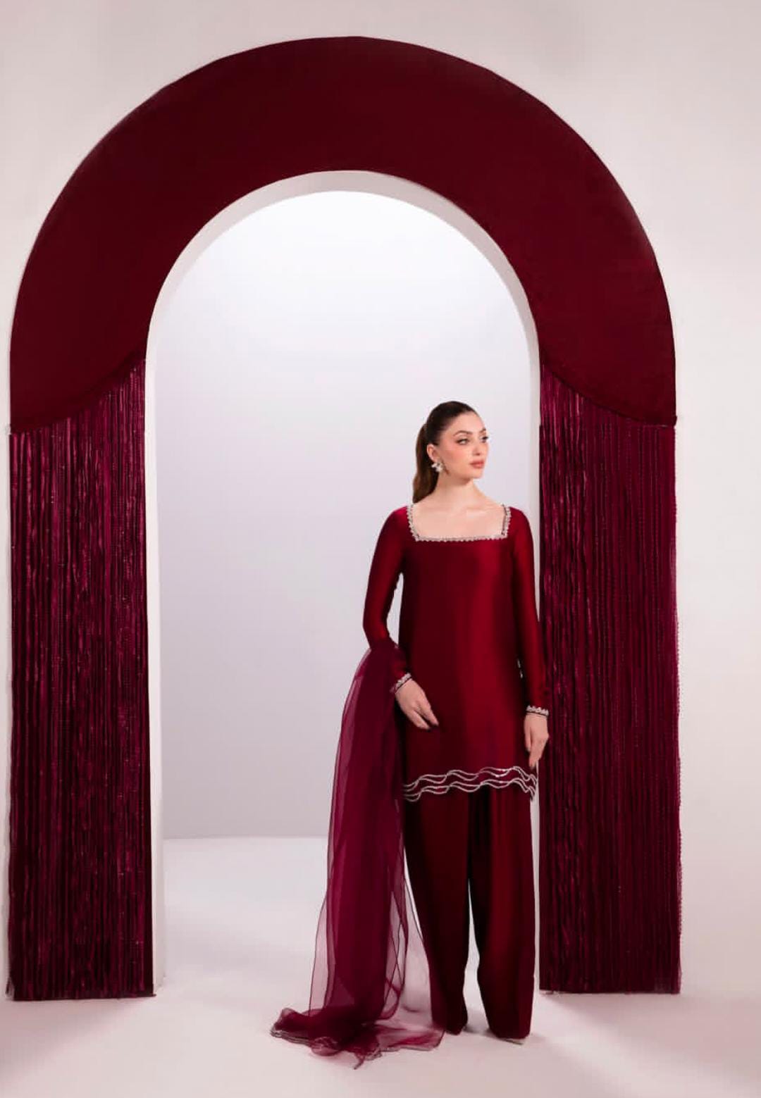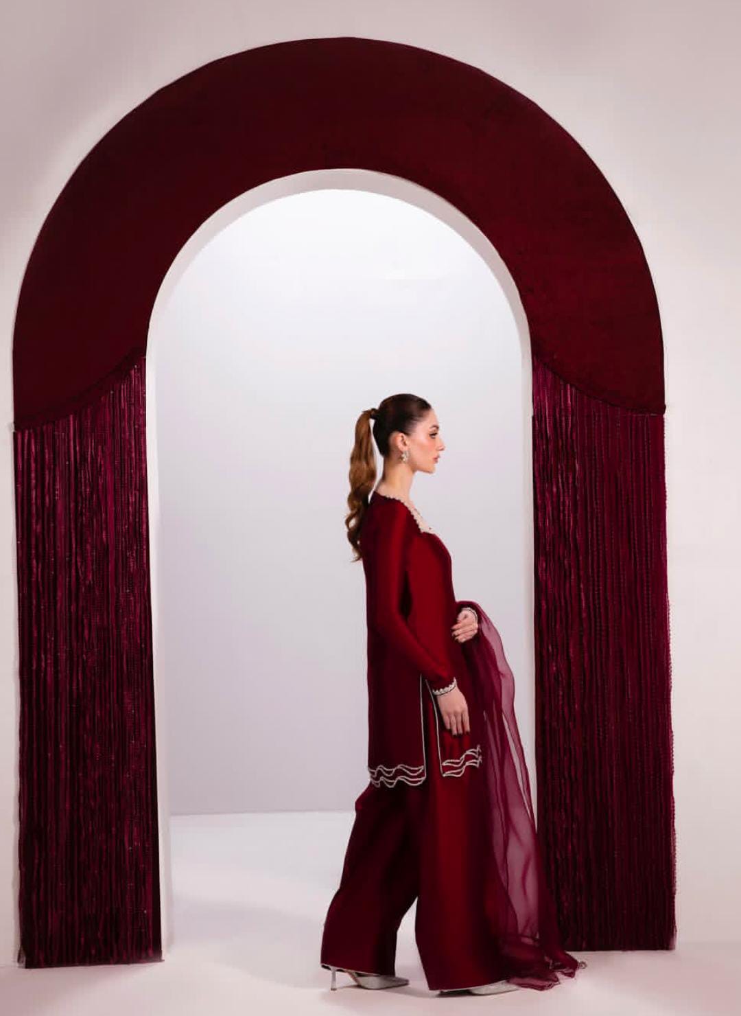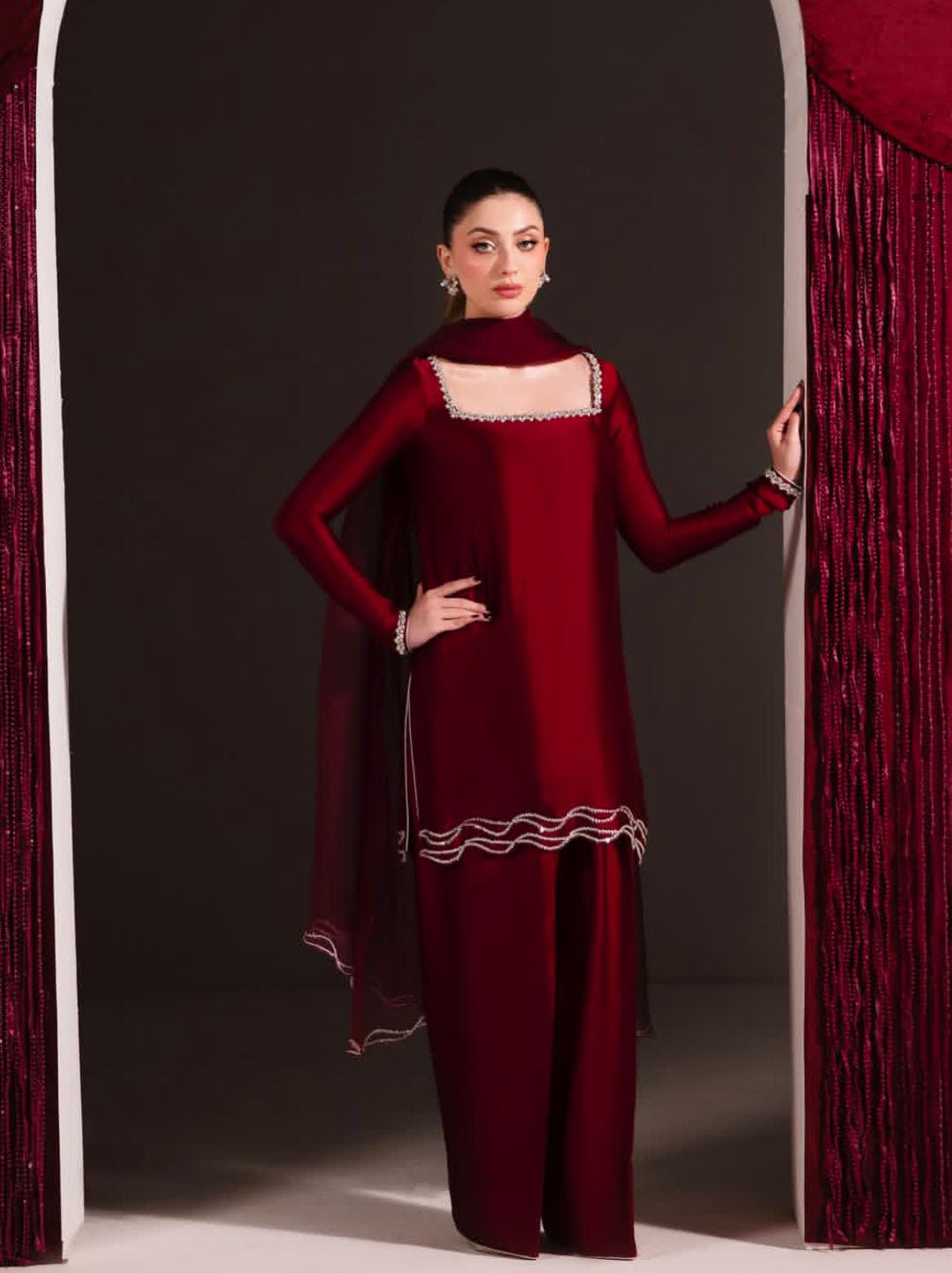 The “Ruby” set is meticulously crafted to capture hearts. Designed for the modern woman who loves a fusion of bold color and contemporary cuts, this deep reddish-maroon ensemble stands out with its luxurious silk texture. The square neck and shorter shirt length offer a chic, high-fashion look that is perfect for festive gatherings.