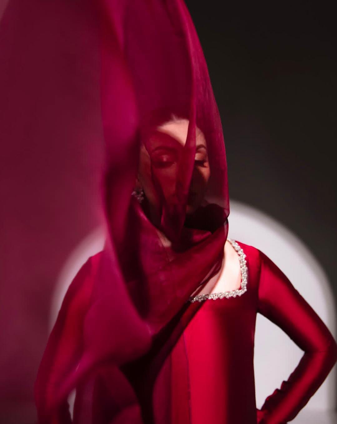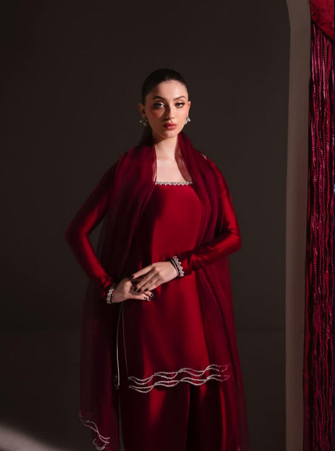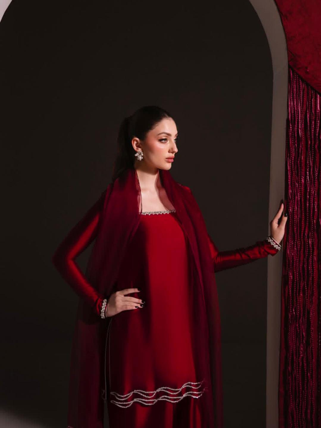 The “Ruby” set is meticulously crafted to capture hearts. Designed for the modern woman who loves a fusion of bold color and contemporary cuts, this deep reddish-maroon ensemble stands out with its luxurious silk texture. The square neck and shorter shirt length offer a chic, high-fashion look that is perfect for festive gatherings.